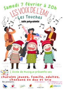 Le samedi 7 février à 20h dans la salle polyvalente des Touches, venez partager un moment musical avec notre spectacle vocal : 100% voix, 75% chorale, 25% technique vocale, 100% plaisir !